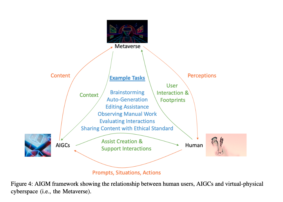 아래의 AIGM 프레임워크AI Generated Metaverse는 메타버스에서 인간과 컨텐츠의 상호작용에 대한 방법들을 제안한것이다. 예를 들어 메타버스에서 할 수 있는 업무들로 브레인스토밍, 자동생성, 편집 보조 등 다양한 활동들이 가능할 것이다. 그렇게 함으로써 개인화된 직관적인 추천으로 인터렉션으로 사용자의 메타버스 경험이 향상된다는 것이다.