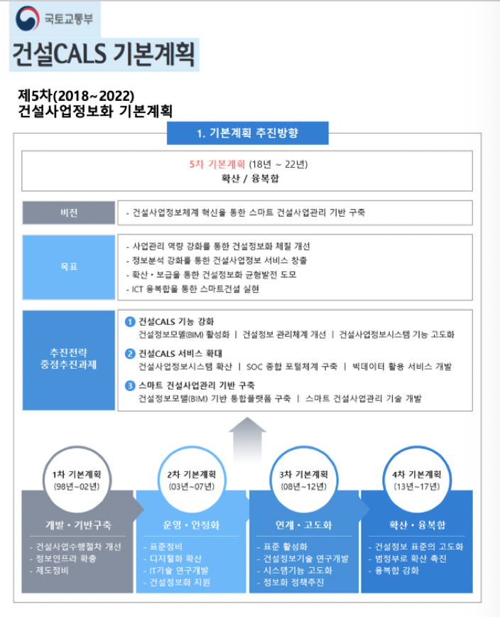 따라서 국토교통부에서 시행한 5차 건설 CALS기본계획으로 2022년까지 보다 빠른 건설사업정보화를 목표로하고 있다. 3가지의 중점적인 추진목표가 있다.